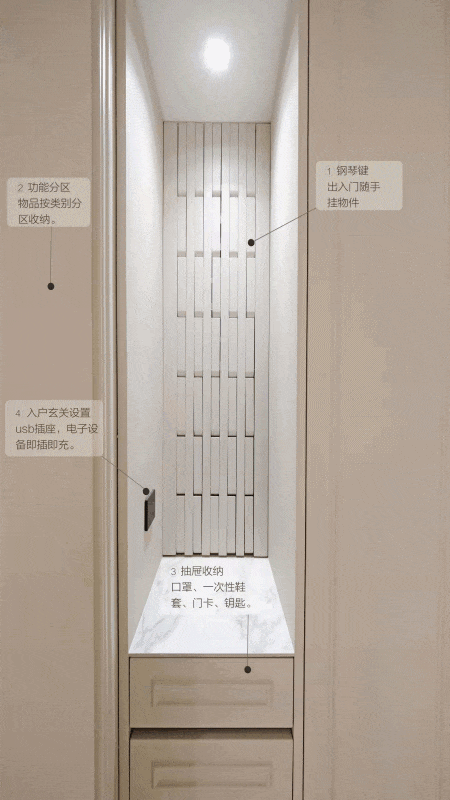 不仅设有优雅的钢琴键挂钩方便悬挂包袋围巾,更配备智能鞋柜,不仅从容收纳并具备杀菌除臭功能;独特的勾脚抽设计,让老人和孕妇无需弯腰即可轻松换鞋。