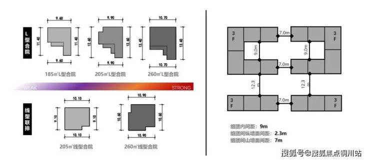 首先是产品选型和模块间距控制。L型合院和线性联排是别墅单体的主流产品,在确定组团内、组团间建筑间距的基础上,我们对两种单体分别进行线性排布和围合排布,推演出四种组团产品排布模式,梳理出不同模式的特征。