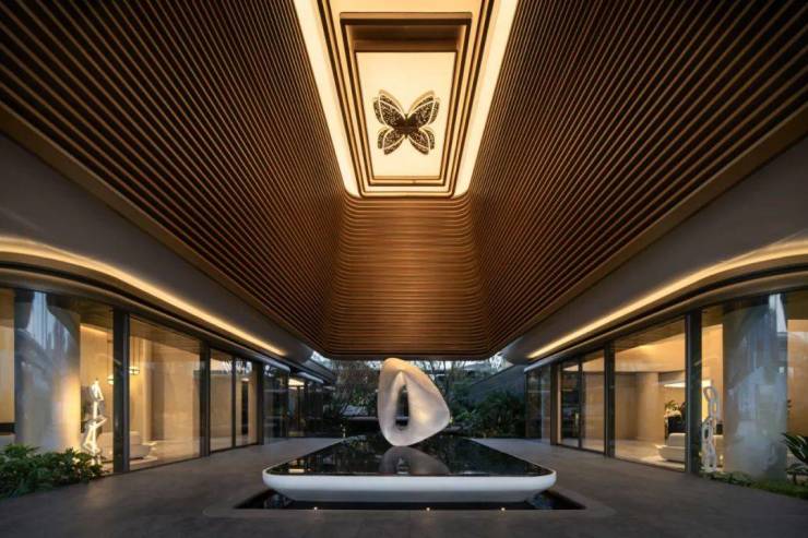 一用矩形水镜和「珠宝盒子」合拢横向视线,引人深入;水镜上单立一片翅膀雕塑,走近看才发现另一片藏在水镜中,虚实相依,是梦境与生活的隐喻;