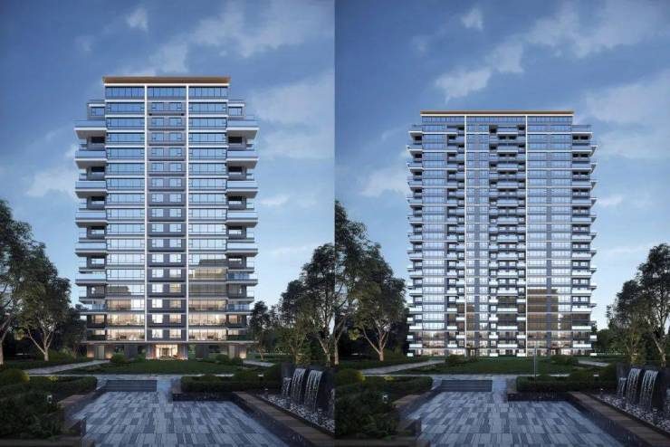 中建·宁悦府立面颜值很高,采用现代简约风格,灰白色调与局部暖色调结合,营造高级大气的视觉效果。材料上选用真石漆、铝板线条和大面积玻璃,并加入金属线条装饰,和谐统一。