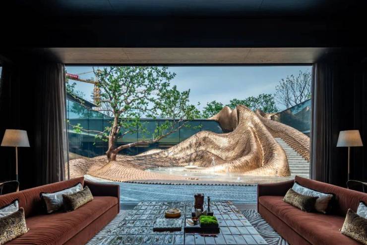 整个景观场域,最引入瞩目的无疑是示范区节点主景观、下沉庭院中庭景致“两宜来”,取意于《永乐大典·乐章》“箫韶九成 凤凰来仪”,箫韶之曲连续演奏,凤凰也随乐声翩翩起舞。优美的音乐、艺术达到至高境界,吉祥美好也会随之而来。