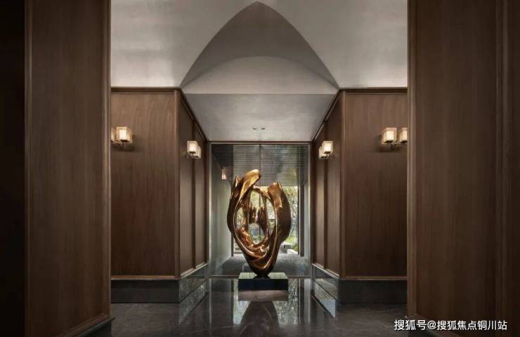 穿行过归家大堂,柱廊的空间序列与源于上海荣宅等经典场景转译,共同唤醒一份根植于内心的在地文化感知。步入轩敞的门堂,荣宅藻井的意象经现代笔触演绎,巧妙地提升了空间的视觉高度,让尊崇之感于此静静沉淀。前厅借由通透的玻璃界面,将内庭的盎然绿意与流动的天光温柔引入,身心也随之沉浸于悠然之中。