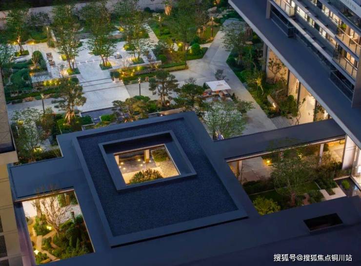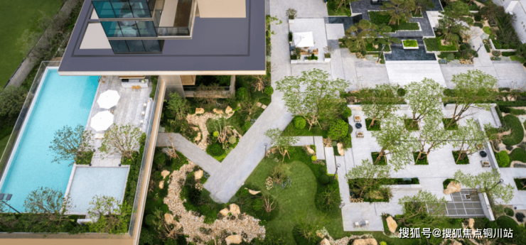 「林影浮翠 」 景观区汲取了景观大师詹姆斯·伯纳特的树阵设计灵感与建筑大师路易斯·康的轴线水景哲学,打造出一处兼具艺术性与功能性的沉浸式园林。