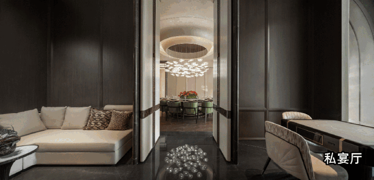 多功能私宴厅融合用餐、茶叙与休闲功能,配备专业茶台与嵌入式酒柜,满足从家庭宴请到商务接待的全场景需求;