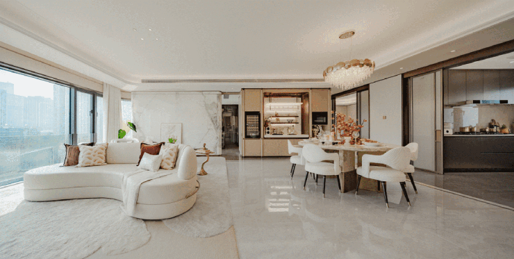 客厅、餐厨与活动区完全贯通,形成家庭核心场域——孩子玩耍、朋友聚会、家人互动,皆在同一视野下自然发生。