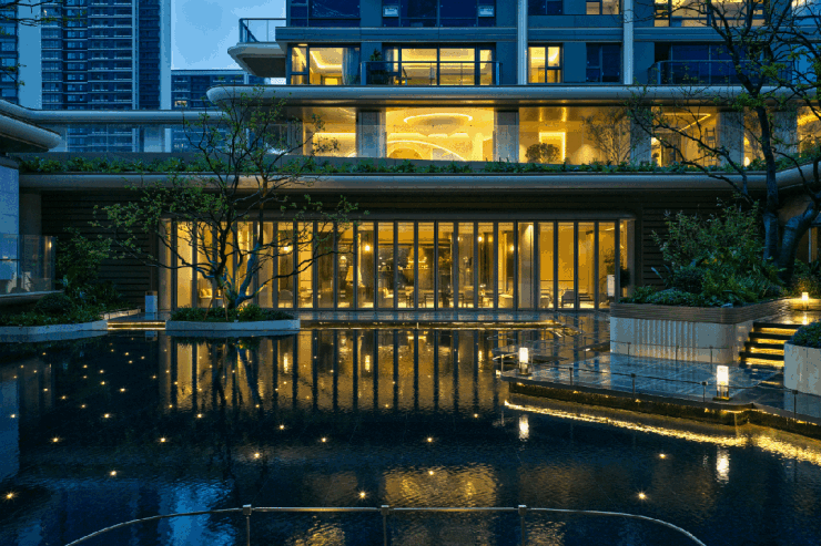 得益于独特地势,七里江澜府围合出约7500㎡中央共享花园,并嵌入下沉庭院会所、拾光花园、疗愈花园等多重景观空间,建筑仿佛被花园温柔包裹,形成具有连贯性与延续性的森屿园境。人在园中行走,移步异景,诗意与松弛自然而生。