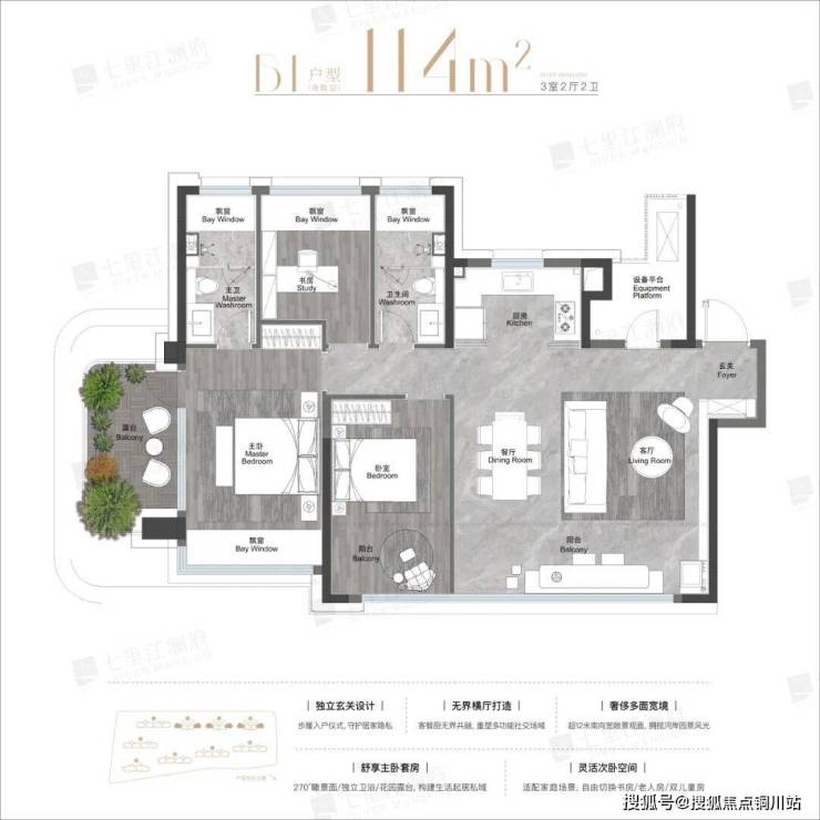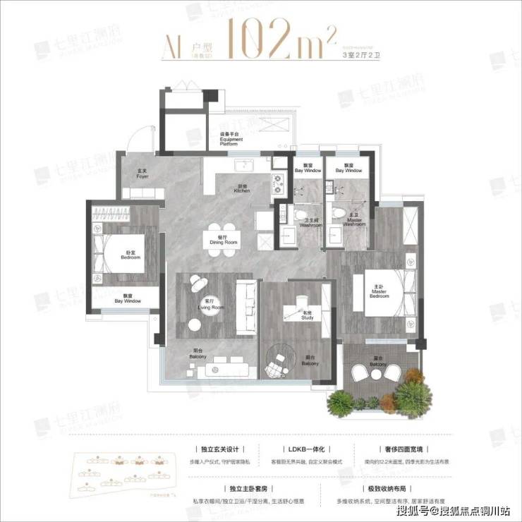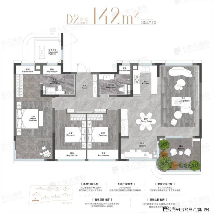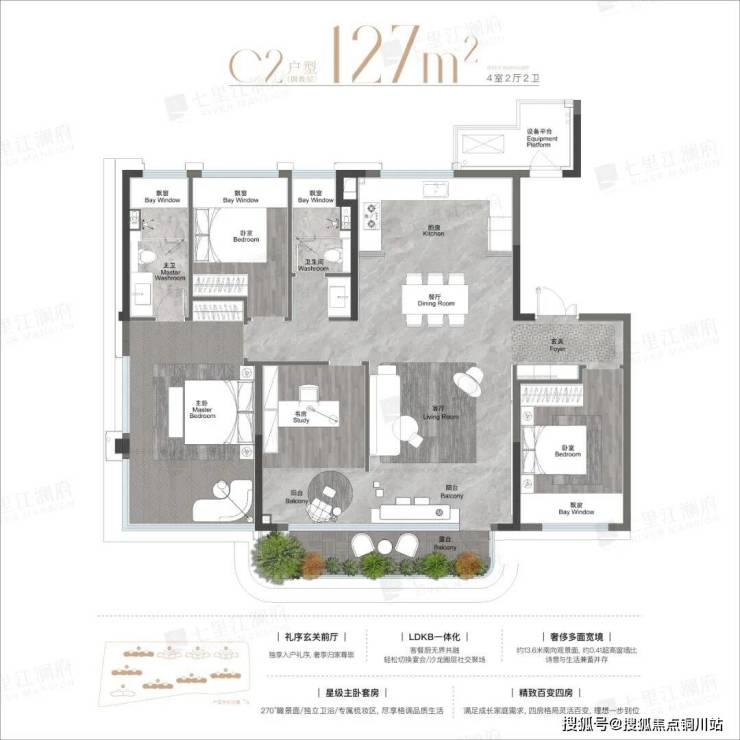 北侧设备平台,可满足家政、收纳等需求;4飘窗,延伸更多使用空间与观景视野。