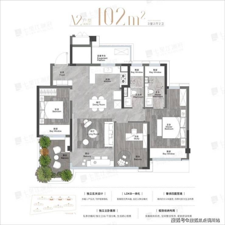 约12.2米的南向面宽、独立入户玄关、有衣帽间的套房主卧……这并非出自建面约130㎡级别的户型,仅仅是七里江澜府建面约102㎡“门槛级”户型的配置。