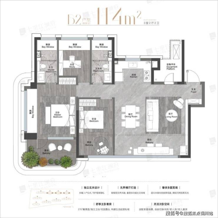 还有,七里江澜府的赠送空间极为可观,阳台、露台、多飘窗、设备平台,实现超100%的空间实得率。