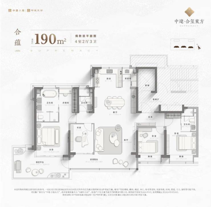 除了目前已公开的建面约190㎡和建面约235㎡的样板间外,中建·合玺东方还有建面约268㎡的更大面积段的户型产品,露台端厅也是一样不落,更奢阔的空间尺度,更加能够提升生活品质和居住体验。
