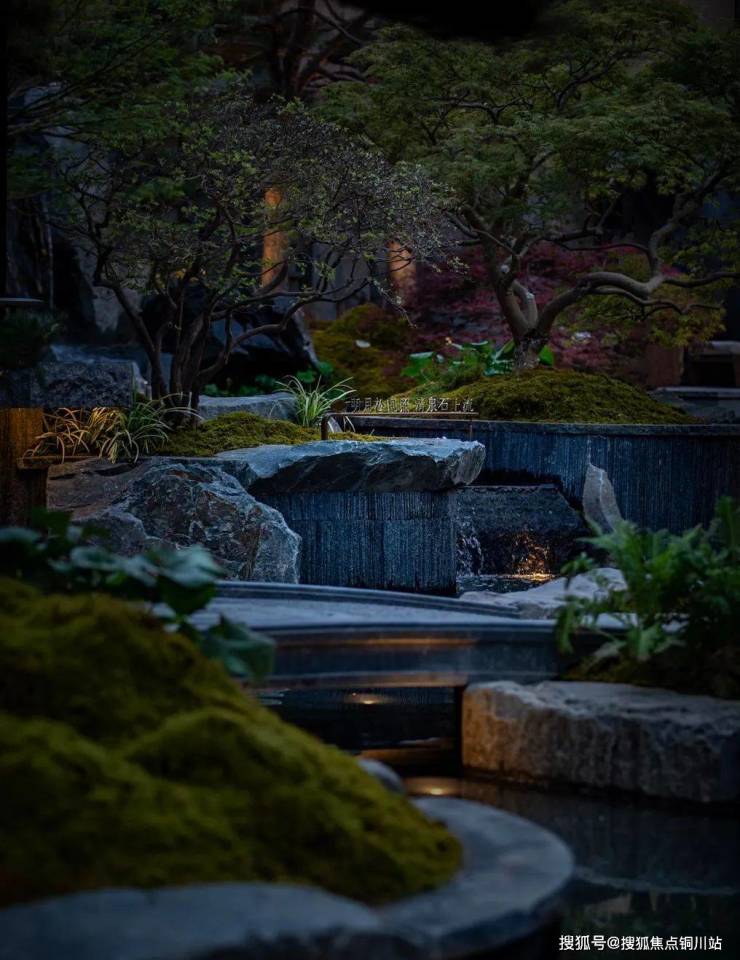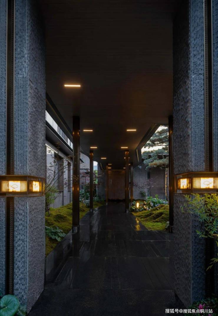绿城·逸庐延展地块红线外的转角公园,打造约500m²的山水归家前场。由多块中国黑老石皮整石雕琢形成的飞虹瀑,视线的焦点形成了山水叠瀑之象。