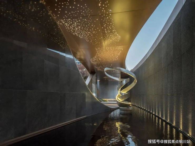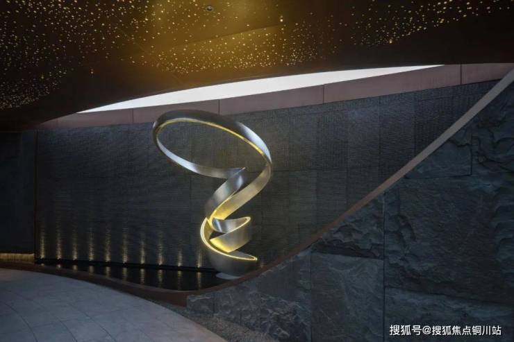 踏入礼宾空间,旋转雕塑以优雅的弧度向上生长,与静水倒影的星空顶遥相呼应。水景如镜,映出星辰流转的轨迹,这一刻,感官与时空交融,都市的喧嚣被悄然抚平,唯有精致石材的低语,诉说着栖居的诗意。