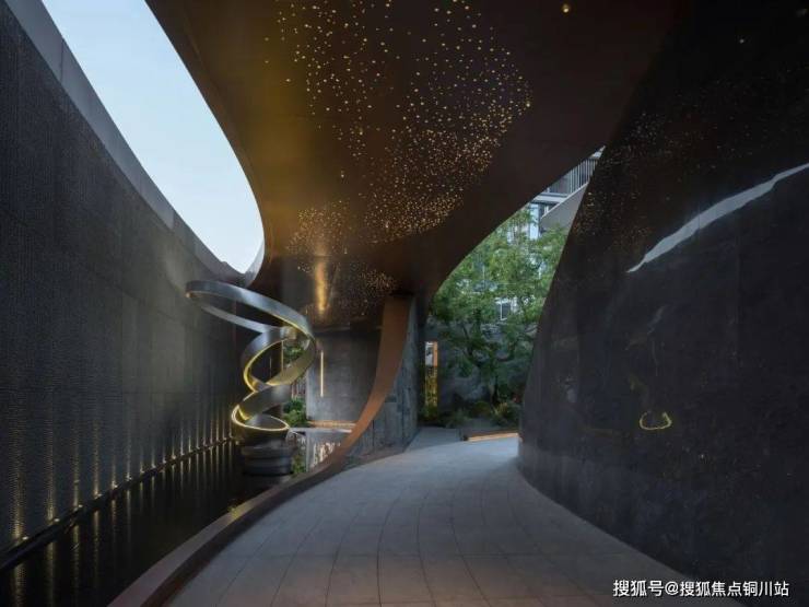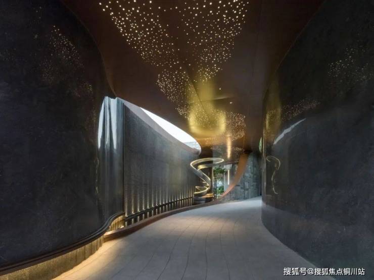 当波纹装置在超长界面上流转,光影与金属的碰撞如潮水轻吟,一场关于归家的仪式悄然开启。人车分流的静谧,精工石材的温润,艺术的波纹在夜色中泛起涟漪,仿佛天地初开时的一抹温柔,为每一位归者献上无声的礼遇。