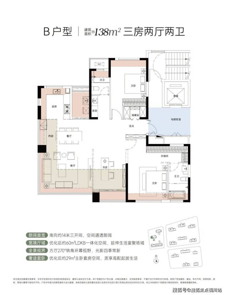 高层采用两梯两户楼型设计,其中138㎡户型采用2+X设计,南向14米大面宽,168㎡户型采用3+X设计,南向15.5米面宽。