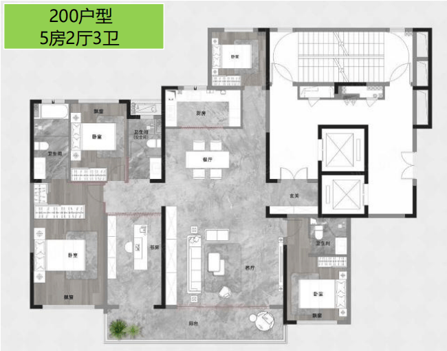 5房3卫格局,独立电梯厅,四开间+南向面宽16.4,采光面好,2T2,客厅6.1米开建,书房+客厅,空间舒适,实用面积约184.6m²,得房率约98%。