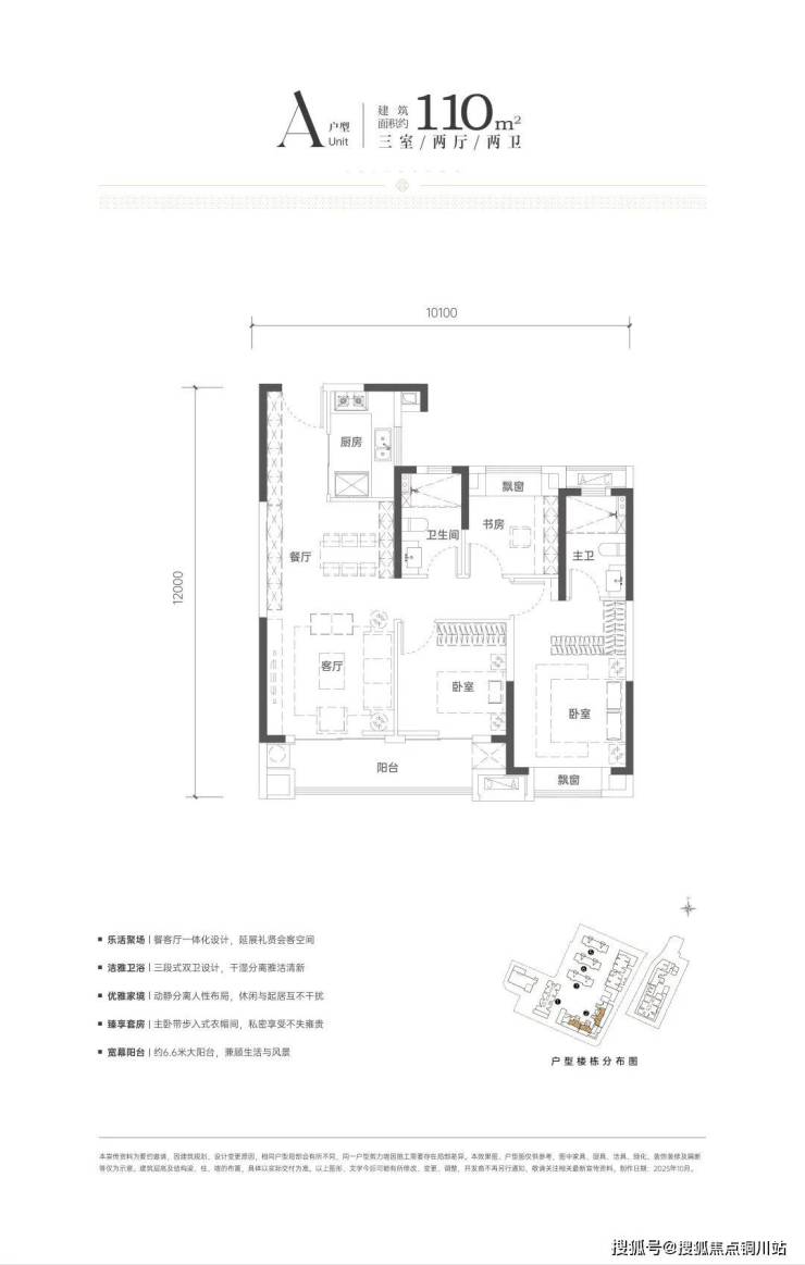这是项目建面约110平的三房两卫户型,南向开间达约10米、三开间朝南、南向跑道式阳台、主卧大套房……