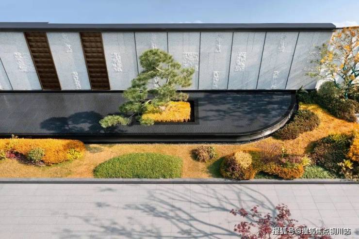 例如,示范区中央有一道延伸进水景的景墙,侧边以石材为主,顶部采用仿铜拉丝金属,留有出水口和水槽,将潺潺的流水融入曲水流觞之中,既传统东方,又不失现代设计格调。