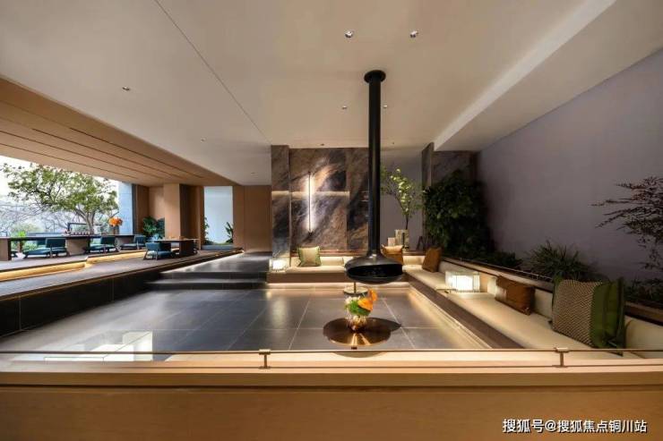 同时在实际设计中,建发·青云上更关注生活内容与空间场景的营造,对架空层共享空间进行深入思考。园林延伸至架空的绿意、U型下沉卡座,以及连纹奢石岩板背景墙、线性格栅等设计,不仅提升了空间的品质感,也营造了一处会客主题的半私密空间。