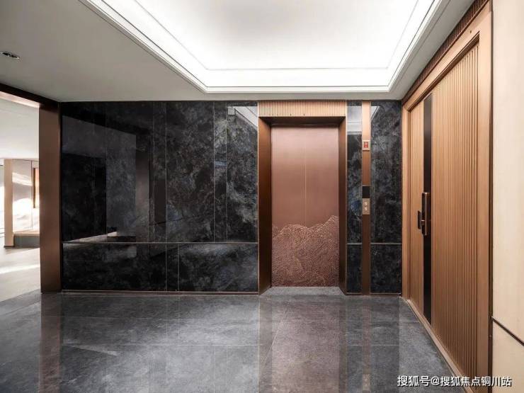 电梯厅金属线条配合考究用材的设计,在归家动线的末端,也营造出了十足的仪式。