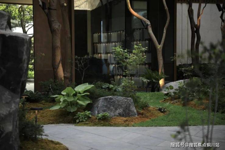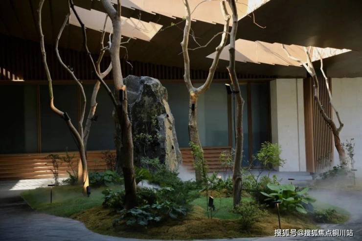 乌桕枝干遒劲如画,自大门之间穿云而上,蜿蜒生姿,昂然向天。海岛春花如随风轻语,点点洒落于林间空隙,蕨类嫩绿,悄然浮现于苔藓深处,‘蓝伞’玉簪以幽蓝轻抚绿意之海。高低错落间,枝影与花色共舞,谱写一曲隐于山居的绿意合奏,静谧而悠长,自然在光影中低声吟唱。