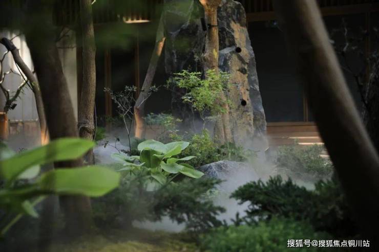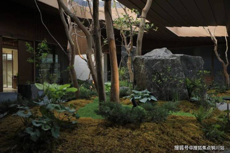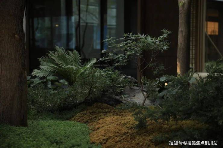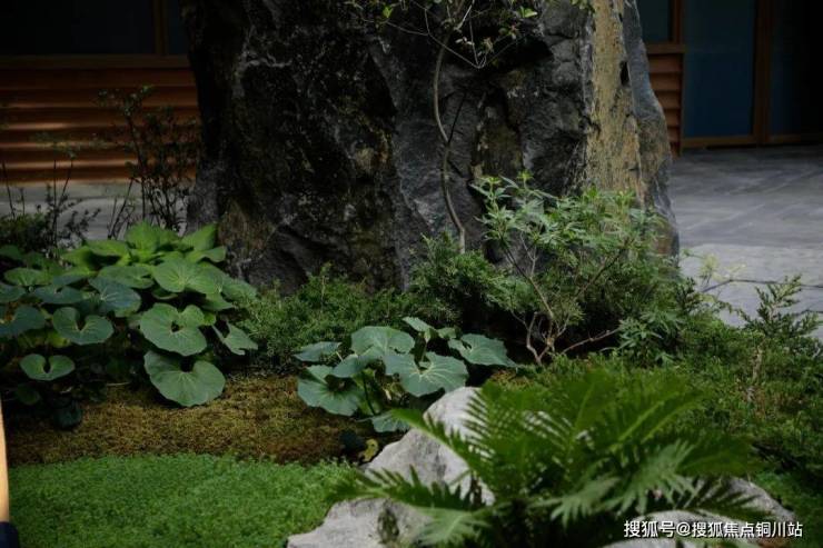 ‘巨无霸’玉簪舒展硕大的叶片,宛如在低调的黄绿色苔藓上撑起一柄柄绿意之伞,为脚下世界投下一抹清凉。海岛春花轻巧蜿蜒,似风中游丝,星点般的叶片洒落空中,流转着不经意的诗意。铺地柏深绿如墨,悄然隐入苔面之中,中华景天则如潺潺细流,在绿意之间缓缓流淌,使每一个微观的片段,都沁入生机与自然的气息……无数隐绿叶片交汇,共同勾勒出低调奢隐的墨绿画面。