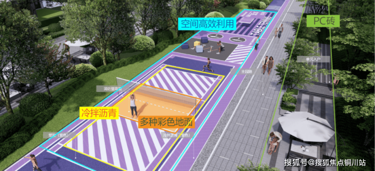 溪屿组团调改部分地面植草格车位为铺装划线,材质选用不同色彩的PC砖、冷拌沥青等搭配铺装,拓展高颜值、高效利用的活动空间。