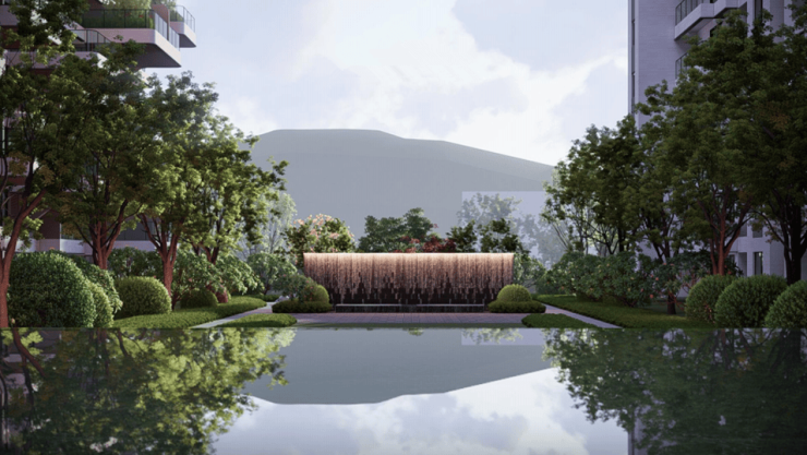 在楼盘内部,小区引入山水文化理念,打造了一个与外部生态兼容的山水秘境。