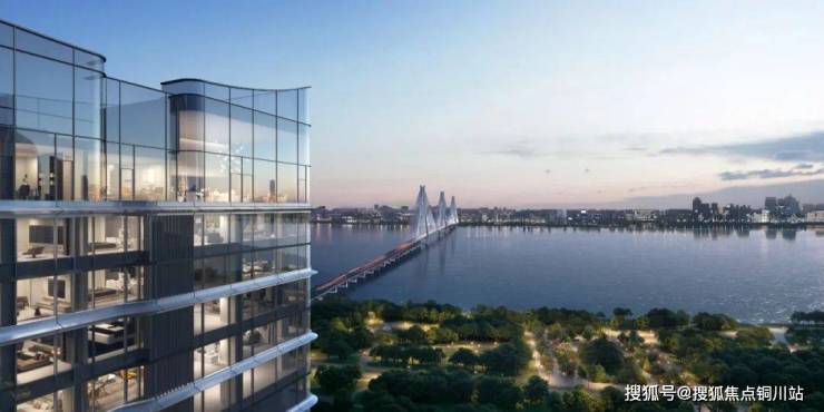 无背立面纯玻璃幕墙体系,公建化城市界面感,突破传统建筑棱角分明的边界感,以360°环幕落地玻璃幕墙体系,搭配横向金属铝板线条造型,阳台外侧采用超大玻璃分隔,保证看江面视野,阳台地面与室内无高差化处理,地暖通铺至阳台;阳台转角柱采用型钢柱设计,通过加强结构强度尽量减少柱截面,不浪费每一寸江景资源。
