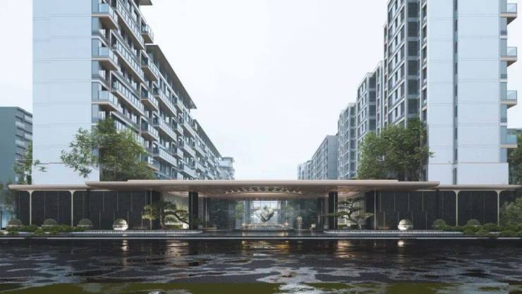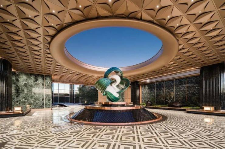 社区大门汲取盛唐皇家宫苑飞檐设计,约66米尺度超级门厅,气场震撼。穿越“门—廊—厅”的星级酒店式门头空间体系,恢弘大门庭、环岛式酒店落客区、朗阔挑高大堂,在动与静的交融间,于喧嚣都市私藏一处闲适的谧境。