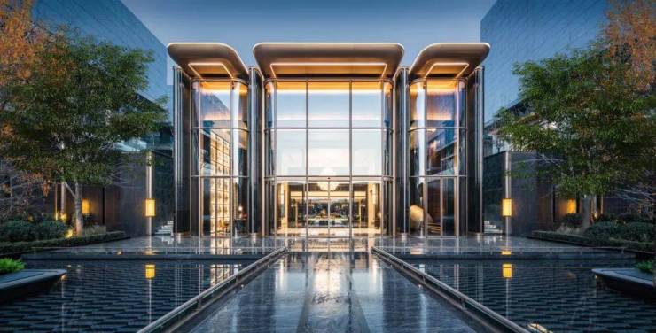 二进院平湖意境,跨水归家。翡翠生活馆在造型上就已冲破了“天花板”,打造天津首座钻石立面业主会所。灵感源自世界豪宅,纽约Lantern House钻石立面,以多面切割工艺技法,为建筑凸窗倒入钻石切割面的光照与反射效果,犹如一颗璀璨的宝石。