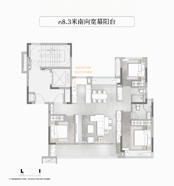 约8.3米南向宽幕阳台,客厅与次卧同瞰胜景,俯仰天地秀色,远眺城市璀璨,客厅与阳台之间无转角承重墙,或可与南向次卧融合改造,放大空间享受。