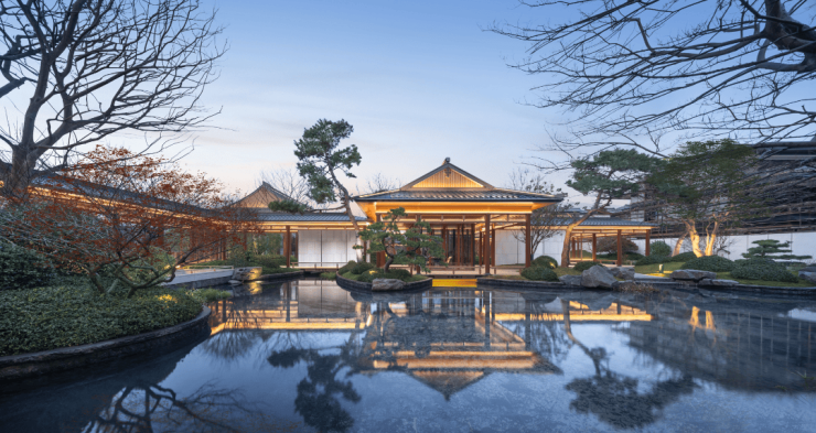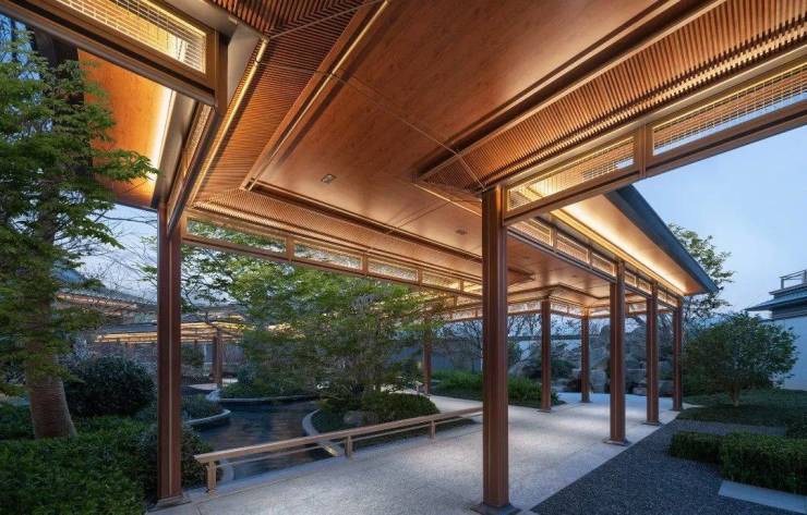 宋式美学设计:项目秉持清润典雅的宋式美学,以中式园林手法营造一园多点、四进院落格局,打造七大奢享场景。从高约 10 米、宽约 26 米的中式威仪府门,到龙鳞纹水景墙、定制古铜金格栅 “华盖” 等,都演绎出宋代宫室殿宇精髓。