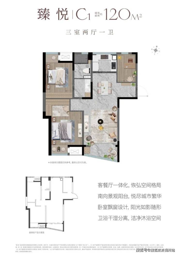 建面约120㎡ 3室2厅1卫:客餐厅一体化设计,连接南向景观阳台。主次卧室均匠心设计宽幅飘窗,将阳光引入室内。卫浴空间干湿分离设计,有效提升使用效率与安全舒适度。