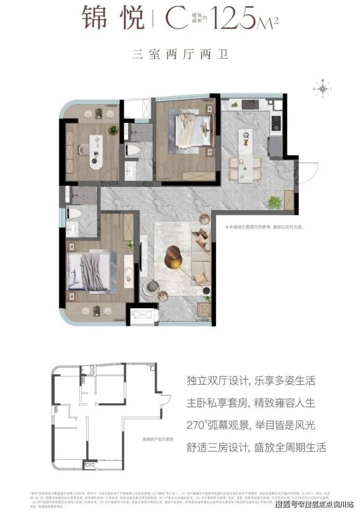 建面约125㎡ 3室2厅2卫:舒适三房格局,创新采用独立双厅设计,空间功能明确,动静分区清晰。主卧尊享套房,构筑专属的静谧领地。270°弧形观景面,将无遮挡的广角视野引入室内。