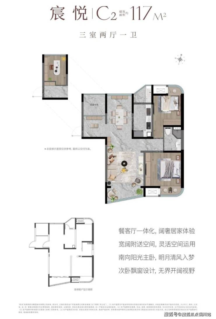 建面约117㎡ 3室2厅1卫:餐客厅一体化设计,规划有宽阔的附赠空间,可根据家庭成长阶段与个性需求自由定义。主卧朝南布局,次卧采用飘窗设计,将视野与光线最大化引入。