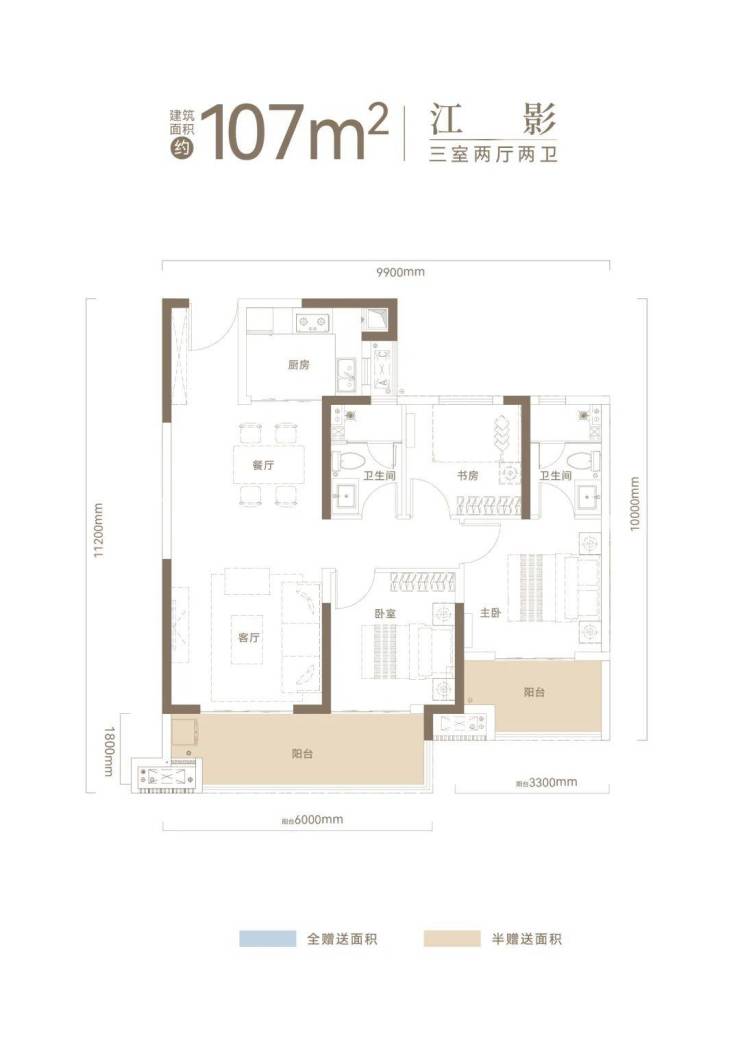 建面约107㎡户型,约10米南向观景阳台+约20㎡主卧套房+全明双卫。