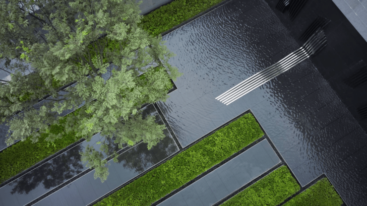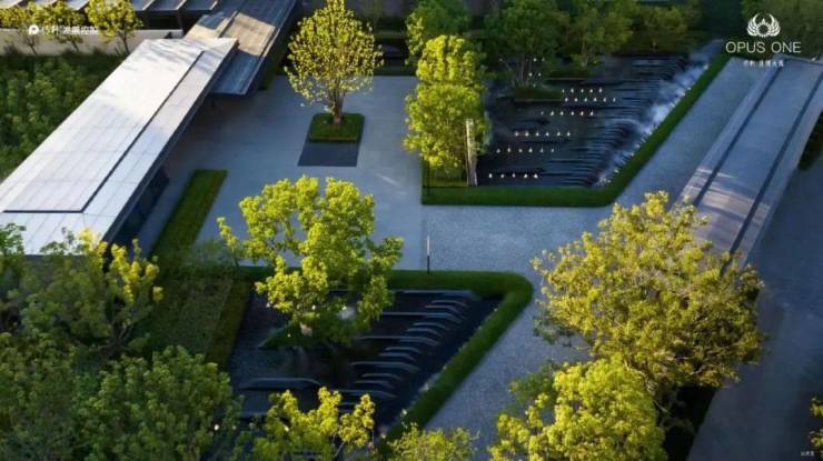 围合式的下沉式庭院,配合形态各异的水景,整体景观立体又灵动:
