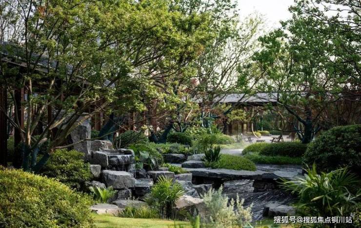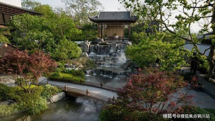 楼盘别墅区和洋房区是隔开的,别墅区打造有独立入园门户,中式飞檐翘角,搭配古铜色金属镂空大门,庄严中不失现代典雅风范,高端大气。跨过大门后,就是贯穿南北的中轴景观,一路归家,一路是品质、生活、美学的产品力展示。景观中轴上,涵盖曲水游廊、叠瀑石景、御水步桥、远山石径、云山亭等,已全部实景兑现。在这里慢行、赏景、观瀑、休憩……一步一景,步步不同景。