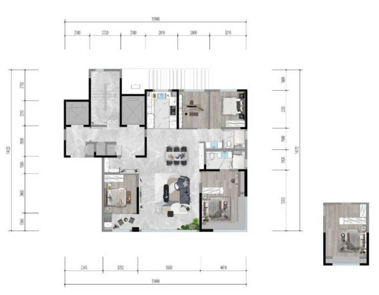 这次首开最顶豪的当然是223平的大边厅户型。两梯一户私享独立电梯厅,还是双开门入户。严格的动静分区,进门向西全是休息区,东侧则是一个非常奢阔的LDKG大边厅,南侧阳台9.4米多,与东侧的飘窗衔接,形成近20米的环幕视野。这个大平层目前在老城区绝对是首屈一指。