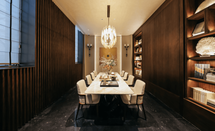 项目的“超配”理念,在约1500㎡的生活美学馆中体现得淋漓尽致。“荷影迎宾”的归家礼序、“墨香怡然”的银龄书屋、“星斗博弈”的桌球休闲、“画舫交盏”的风云会客厅……九大主题空间,覆盖全龄段家庭生活场景。