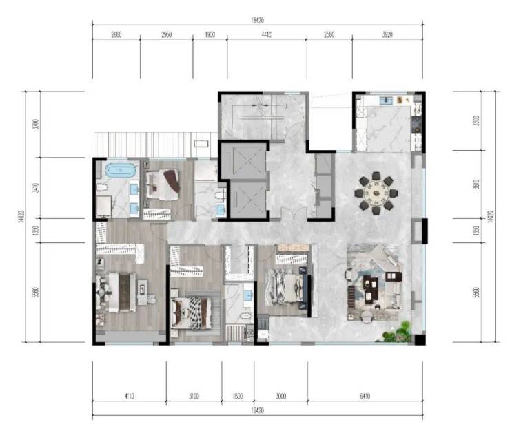 一种选择是四面宽户型,三卧室朝南,还有超10.5米贯通客厅和双卧室的三联大阳台,整体的采光效果更好一些。其中一个南向卧室还可以拆掉改造成大三室,实现7.5米开间的大宽厅效果。