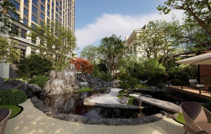 社区占地约2.3万㎡,竟拿出了约1.25万㎡做园林景观,水景面积约600㎡,假山、置石、石桥等石头的运用重量约575.1吨……