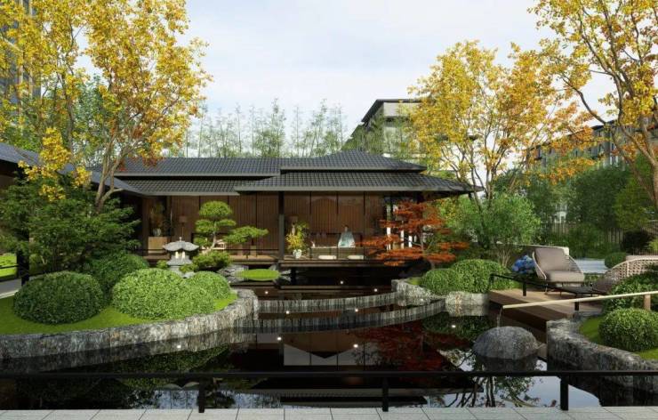 搭配屏风、石灯、置石等,营造禅意自然的山水园林。