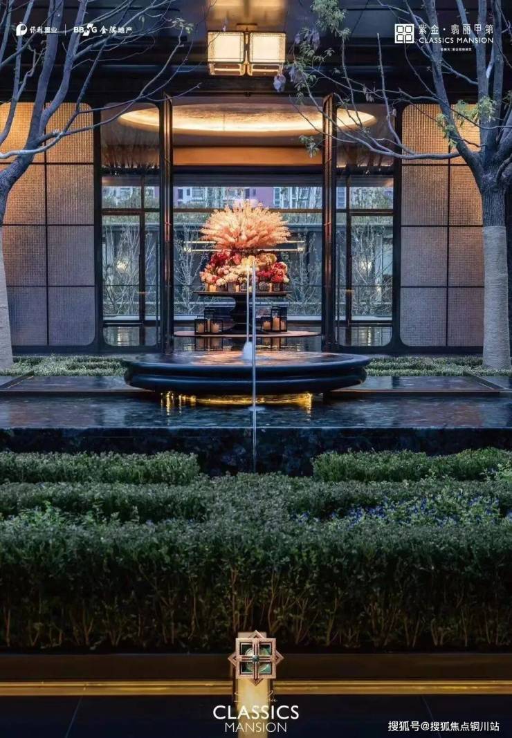 车马院以上海半岛酒店作为灵感来源,在设计方面采用了海鸥丽晶酒店同款的接待门,凸显出尊贵的大家门厅风范;营造社区归家的玄关,下挂式的星空顶、艺术雕塑、迎宾叠水以及范思哲黑背景墙相互映衬。