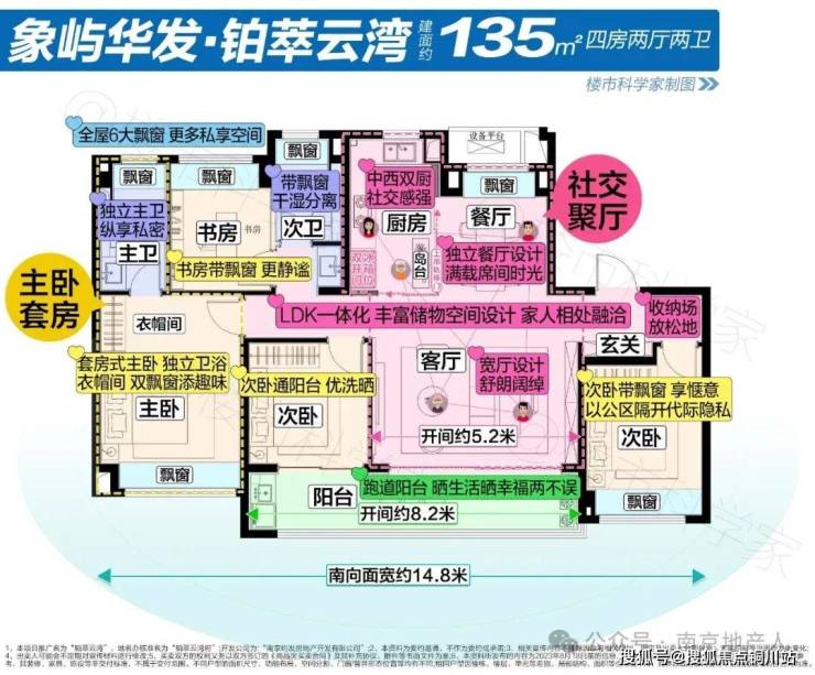 约14.8米南向开间,8.2米开间的跑道阳台,客厅开间约5.2米,与独立餐厅、可开合式的中西双厨组建成活力动区,LDK一体化,丰富储物空间设计,家人相处更融洽,独立的餐厅还带飘窗,三间卧室朝南,整个小区仅有一栋。