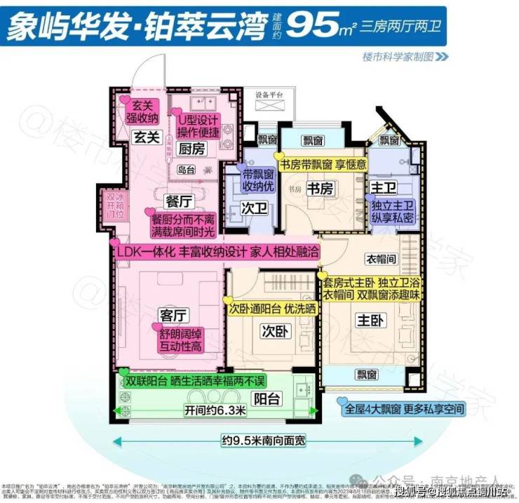 三开间朝南,南向面宽达到约9.5米,约6.3米的南向双联阳台连接着客厅和次卧。