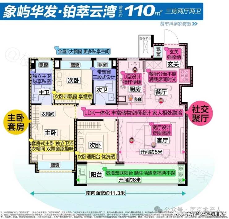 户型南向面宽约11.3米,阳台开间约8米,约5米的横厅开间,这一户型也做了S墙的设计,尺度更开阔。餐客厅一体化搭配开合式厨房,主卧套房设计,全屋五飘窗。