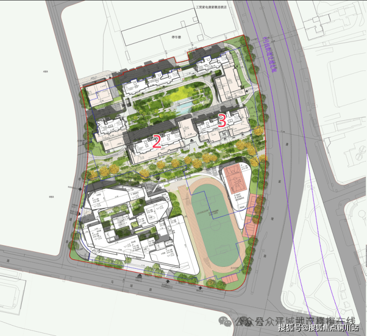 2、3号楼南侧紧邻规划的九年制学校,对视野采光影响很小,且楼下就是学校,还能实现真正的目送式教育;南侧的高线公园、北侧的小区中央景观,都让2、3号楼的视野景观极好。