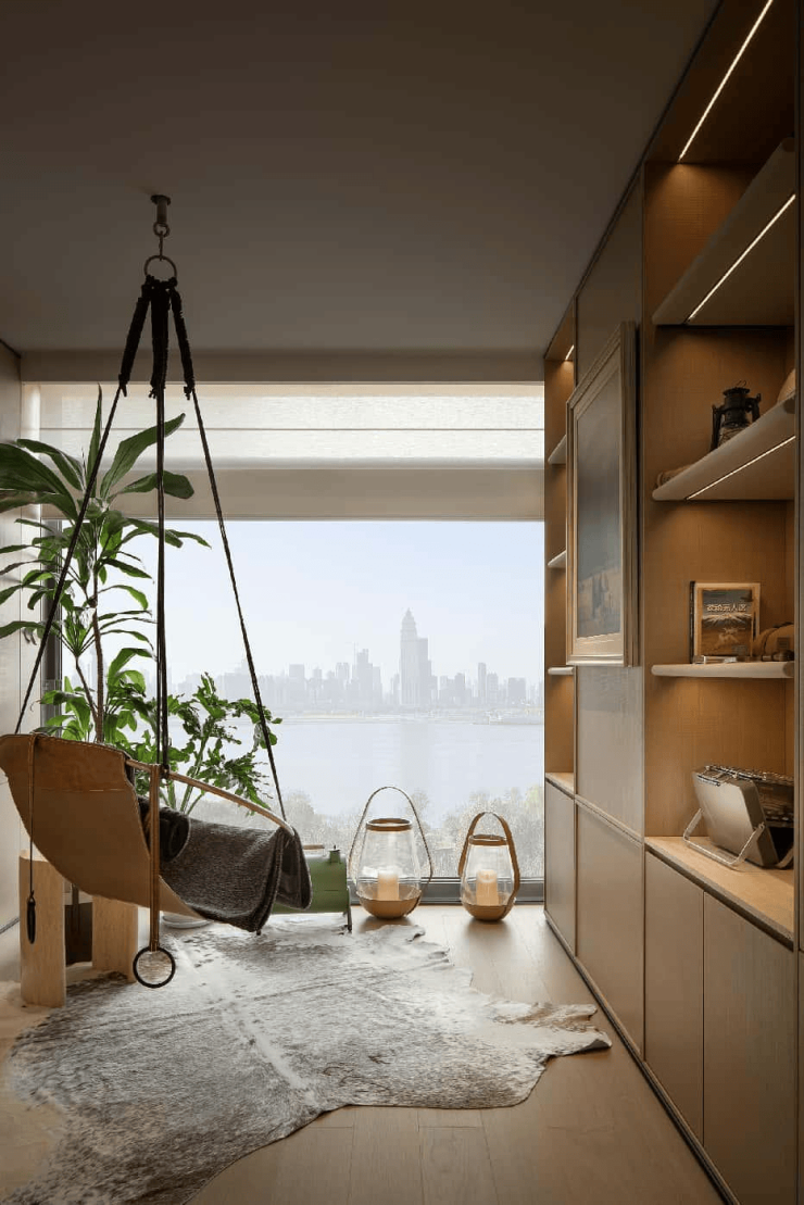 板楼形制,独梯入户,户户瞰江,擢升空间利用率与舒适度,以无柱设计处理转角和室内空间,让居者收获一体式不间断的观江视野,将自然的风景引入室内,目之所及“无止景”。