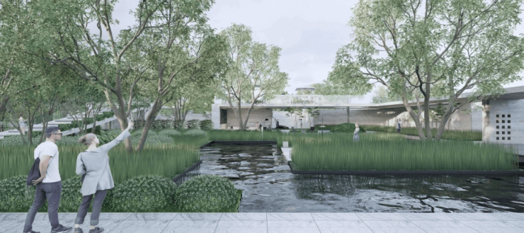 项目景观整体呈现自然开放、去围墙化的设计,将园区通过自然手法与城市形成若有若无的界限,达到公共景观与项目景观的融合与区隔,将项目融于江岸绿化景观之中。项目秉持空间即艺术、艺术即空间的景观设计理念,以武汉江城文化与云梦大泽作为自然基底 ,并以当代美术馆美学作为空间载体, 摒弃过分装饰化的设计手法进行景观打造,植物围绕“谧境”主题进行选型, 儿童活动区域与森系园林充分融合,以再现地域特色、再现生命特征、与饱满纯净平衡的美术馆美学为原则, 匠造“一殿一境三院落”立体森境,各区域呼应都会艺廊、云梦之屿、圣殿花园、云梦翠谷、云梦之汀等景观主题。